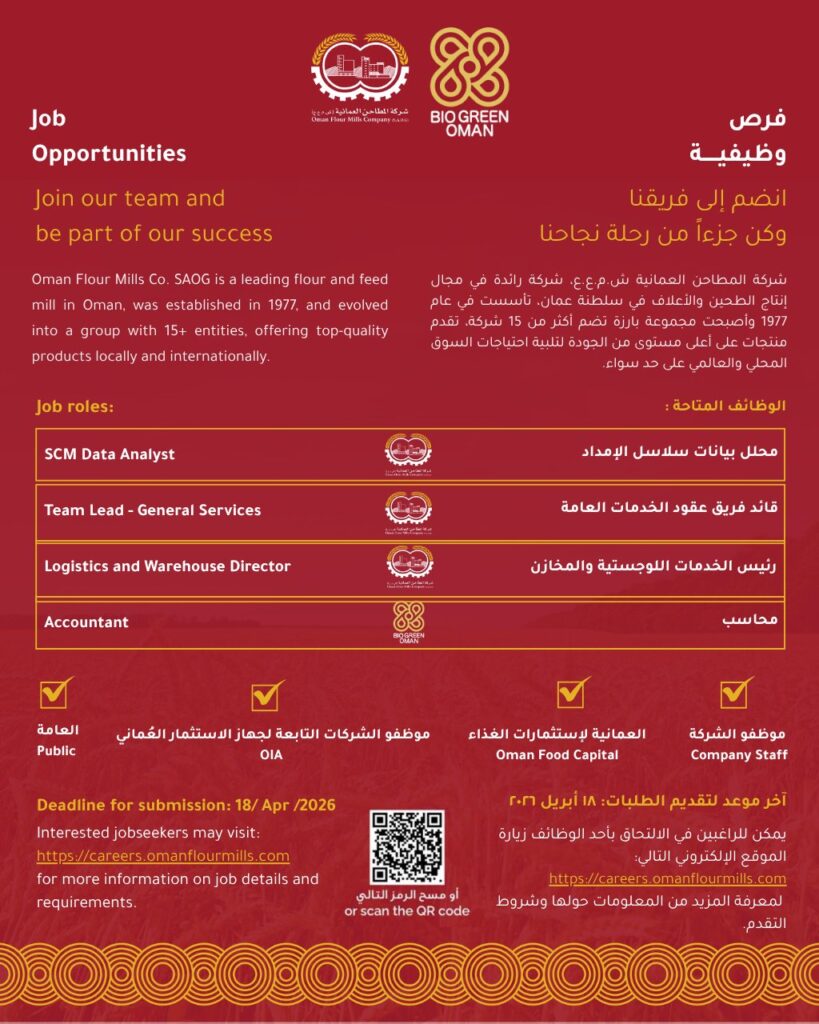 لا تفوت فرصة التقديم على شركة المطاحن العمانية وظائف لعام 2026 وابدأ الآن في التقديم لتحقيق مستقبل مهني ناجح ضمن كبرى الشركات في قطاع الصناعات الغذائية.