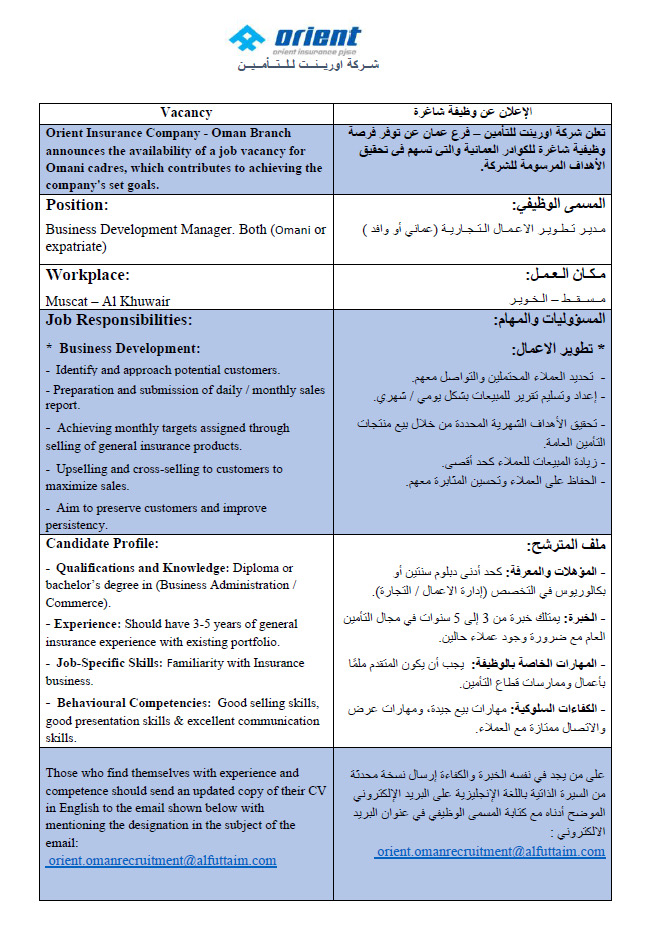 وظائف شركات التأمين في سلطنة عمان – وظائف شركة أورينت للتامين