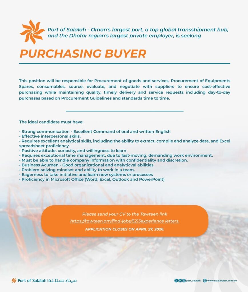 إذا كنت تبحث عن وظائف ميناء صلالة أو وظائف في سلطنة عمان اليوم فقد أعلن ميناء صلالة عن توفر وظيفة شاغرة لعام 2026 في مجال المشتريات وتعد هذه الفرصة من أبرز وظائف سلطنة عمان اليوم وخاصة للراغبين في العمل ضمن بيئة احترافية في أحد أهم الموانئ في المنطقة.