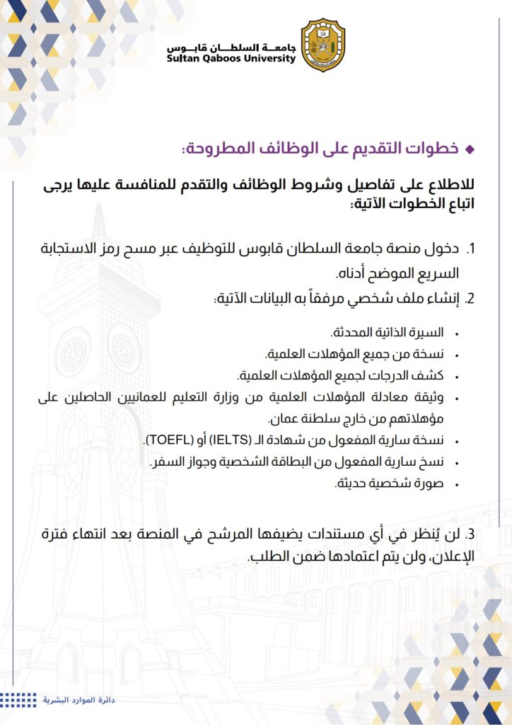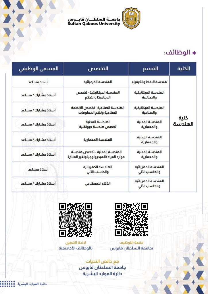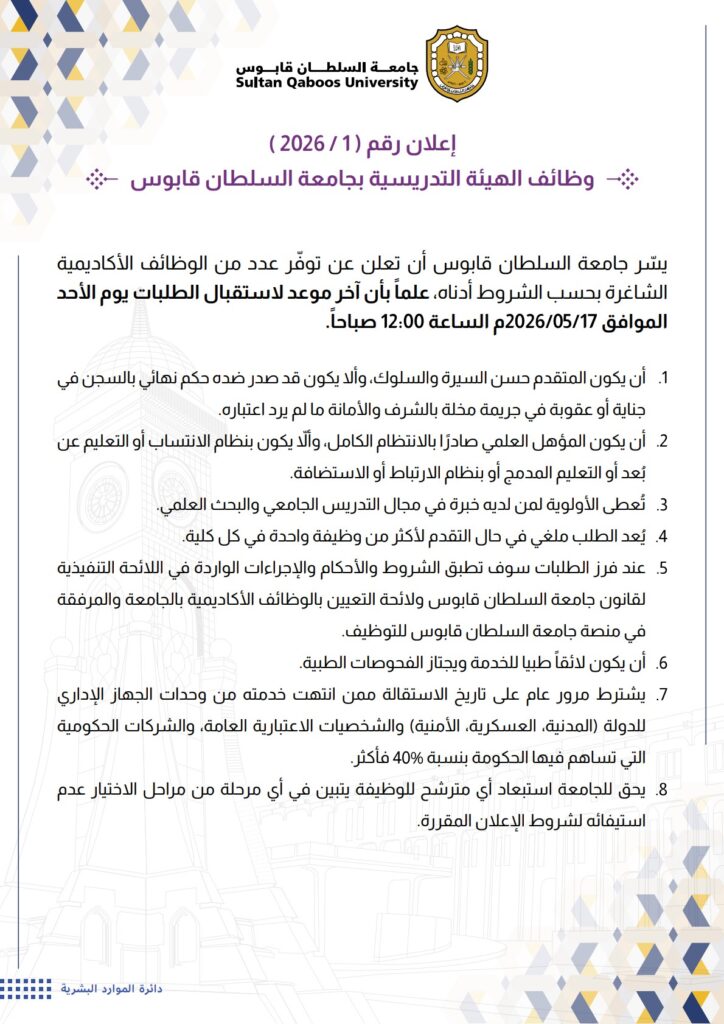 تابع التفاصيل الكاملة حول وظائف جامعة السلطان قابوس وظائف أعضاء هيئة التدريس والتخصصات المطلوبة وطريقة التقديم الرسمية.