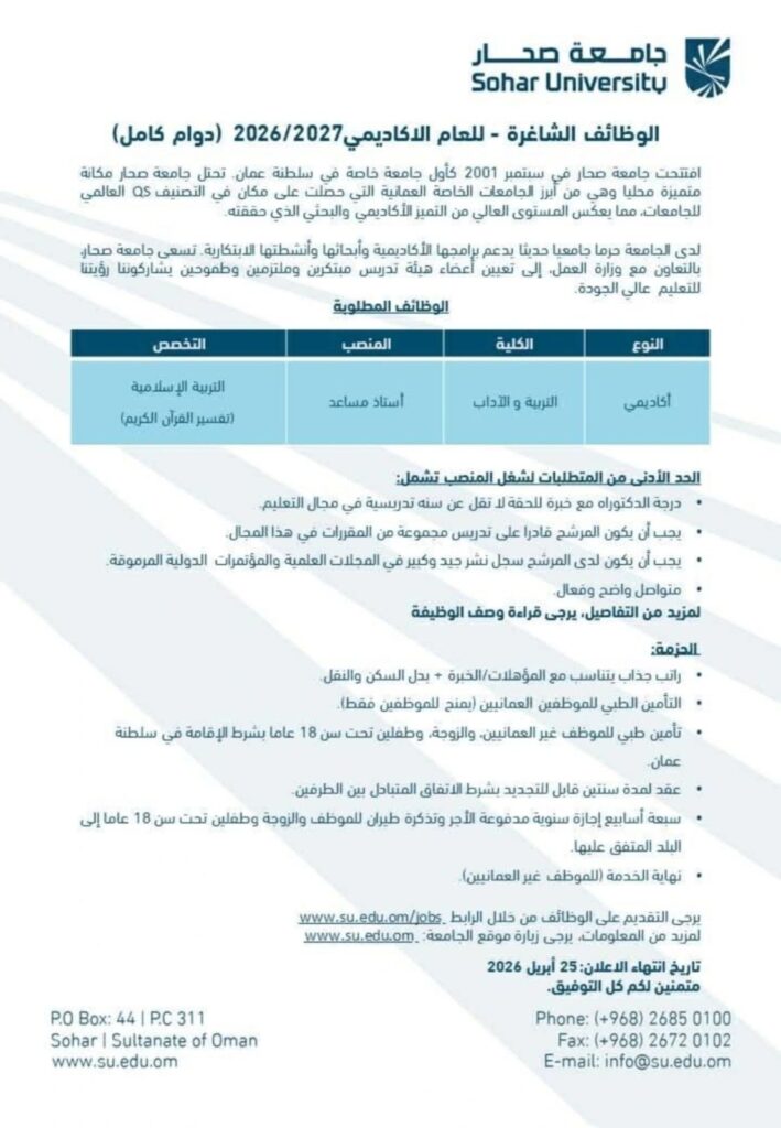لا تفوت فرصة التقديم على وظائف جامعة صحار 2026 وابدأ رحلتك المهنية ضمن أفضل جامعة صحار وظائف التدريس في سلطنة عمان.