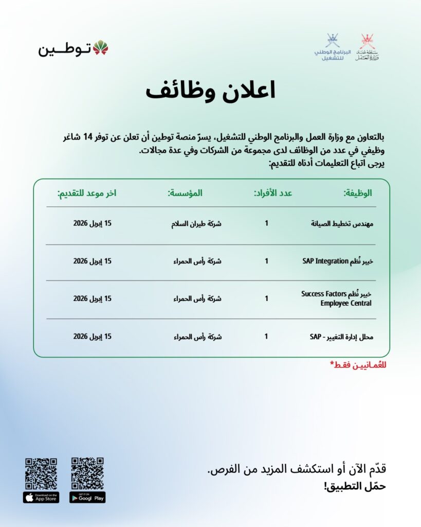 توطين للباحثين عن العمل في سلطنة عمان اليوم تقدم لكم وظائف متعددة في عدة شركات كبري في مختلف المجالات وذلك برواتب مغرية للرجال والنساء