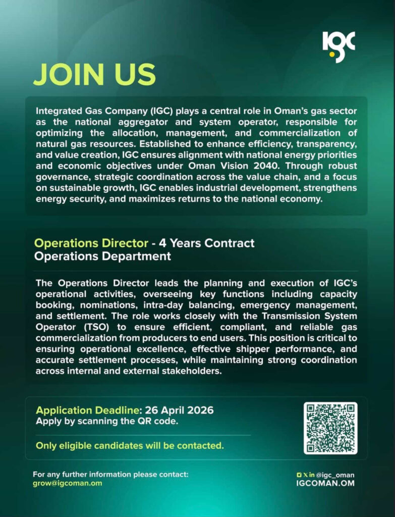 تعلن شركة الغاز المتكاملة عمان عن توفر مجموعة من الوظائف الشاغرة لعام 2026 في قطاع النفط والغاز حيث تعد هذه الفرص من أفضل وظائف عمان اليوم للباحثين عن عمل في بيئة احترافية ومستقرة وإذا كنت تبحث عن وظائف في سلطنة عمان شركات توفر رواتب مجزية وفرص تطوير مهني حقيقية فهذا الإعلان مناسب لك.